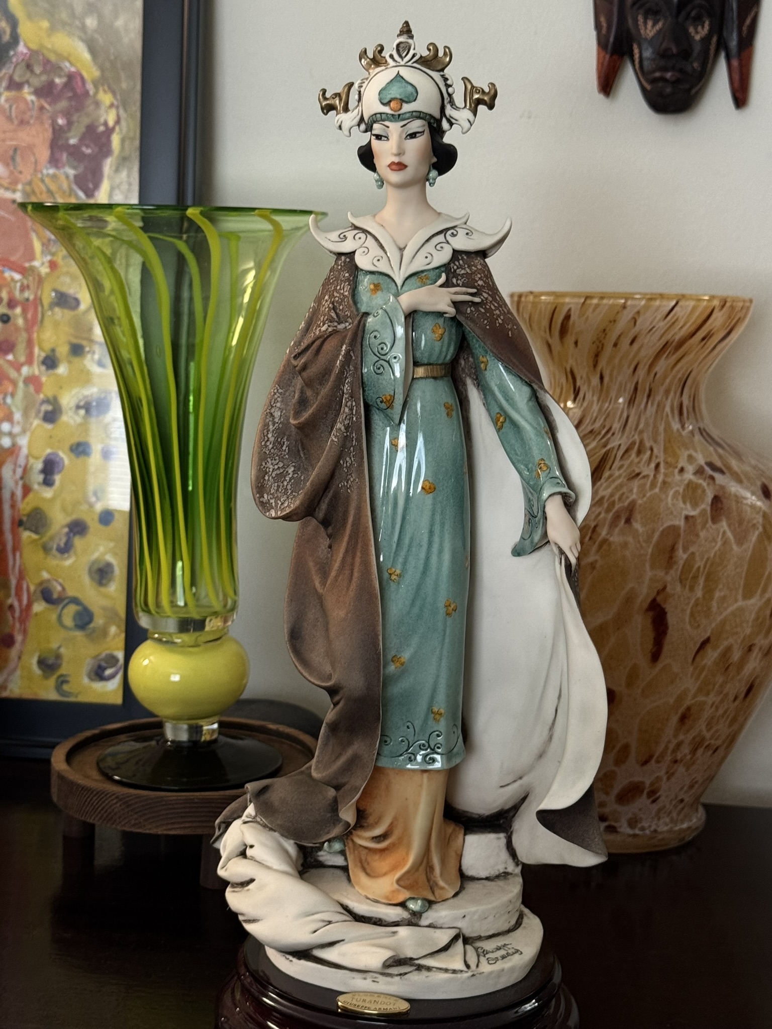 This limited edition figurine, individually numbered at the base, reflects the precision and artistry of Giuseppe Armani’s narrative sculpture. Created for Florence Sculture d’Arte, it exemplifies his passion for blending literature, costume, and emotion into visual form. As with many of his themed pieces, Armani’s interpretation of Turandot combines technical mastery with dramatic symbolism.