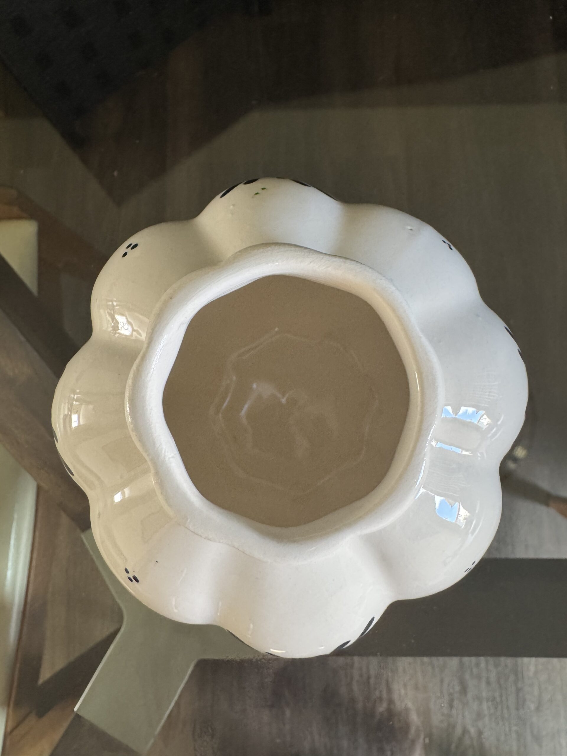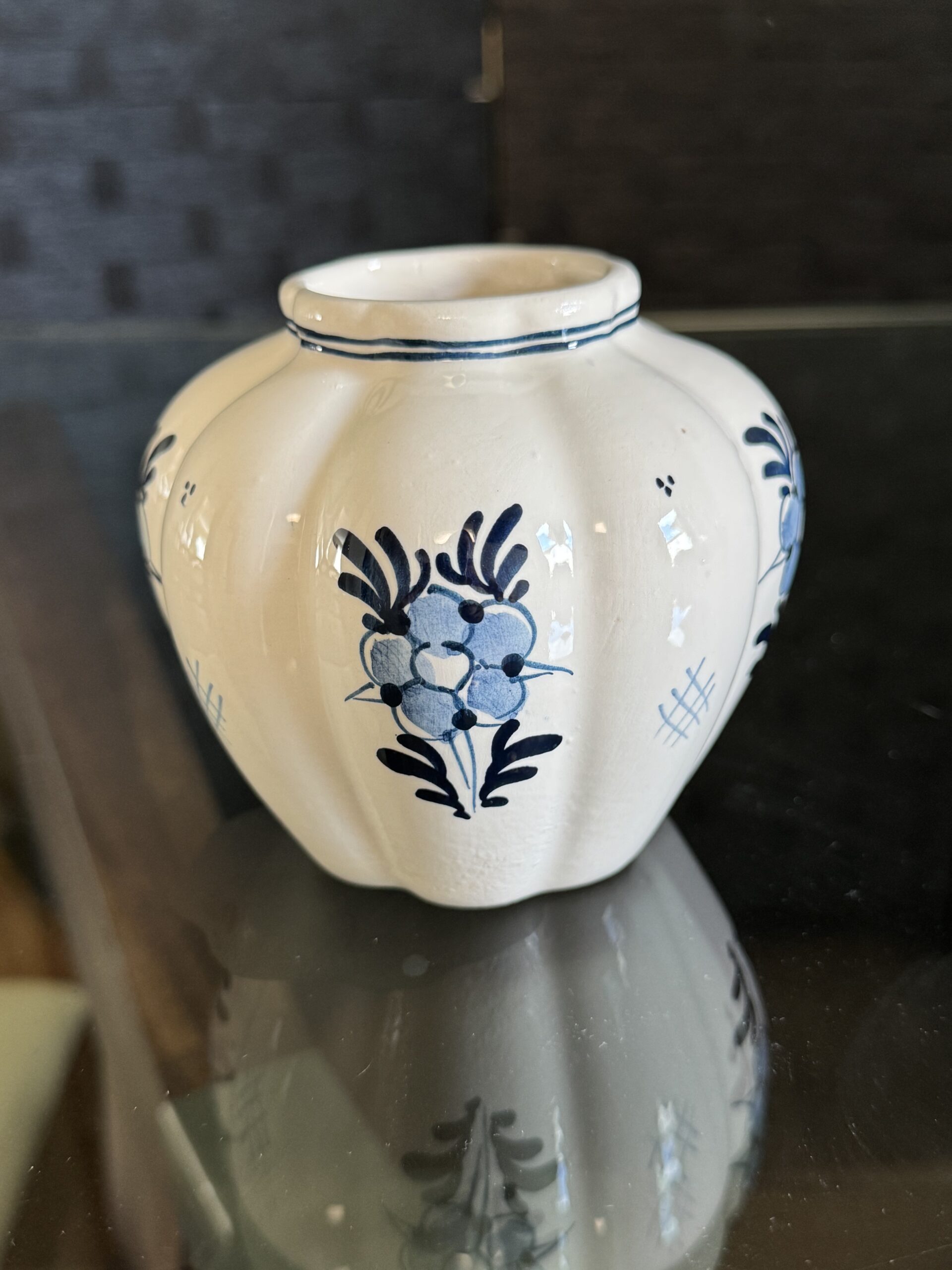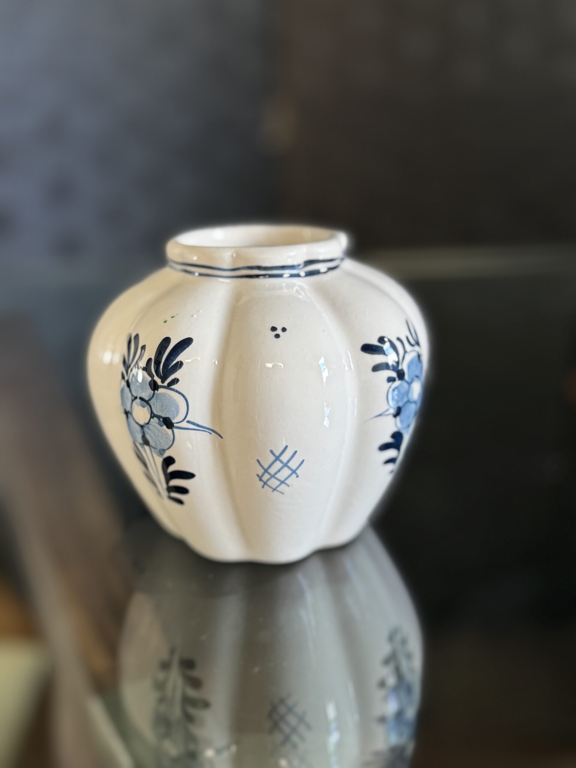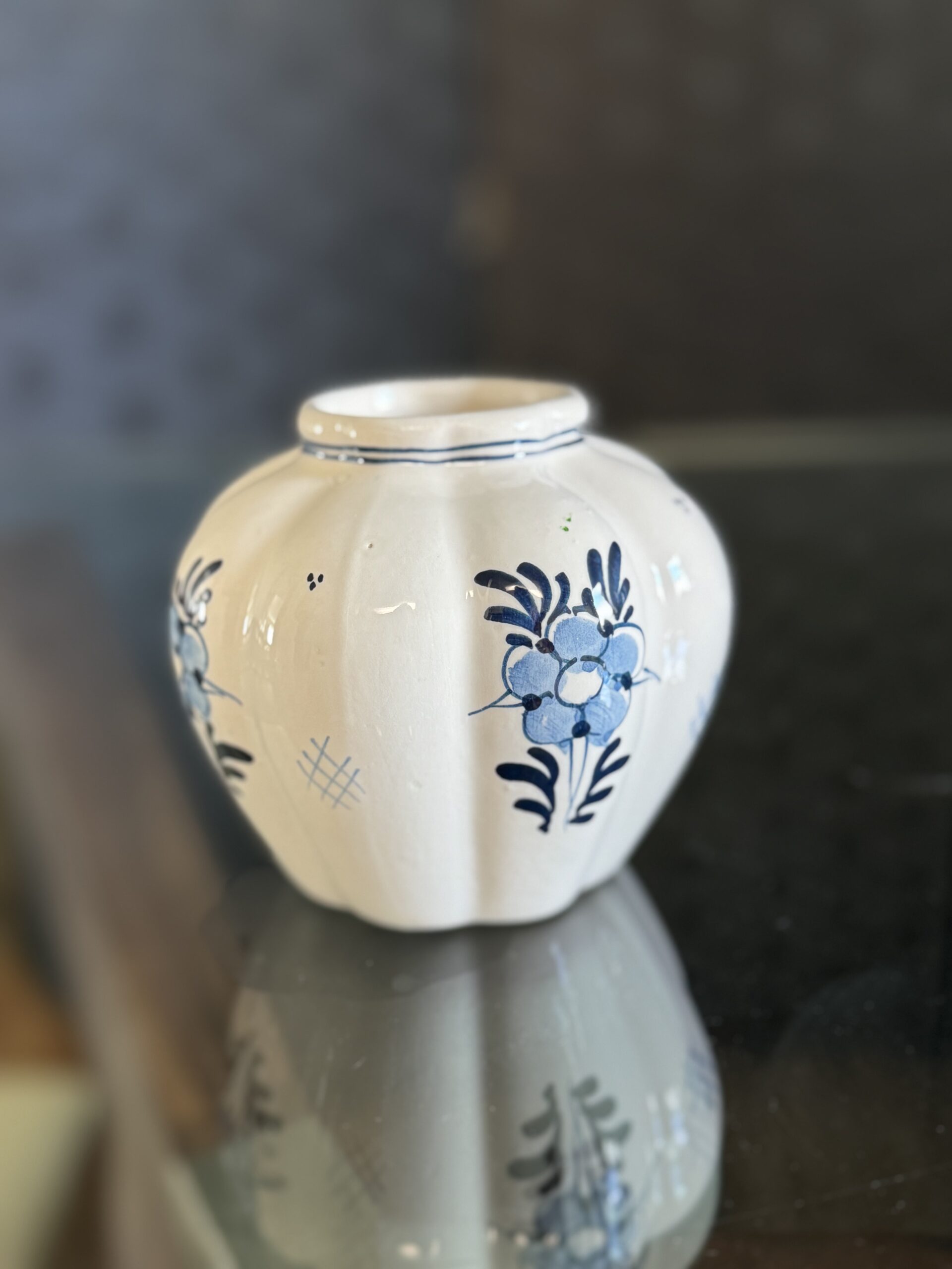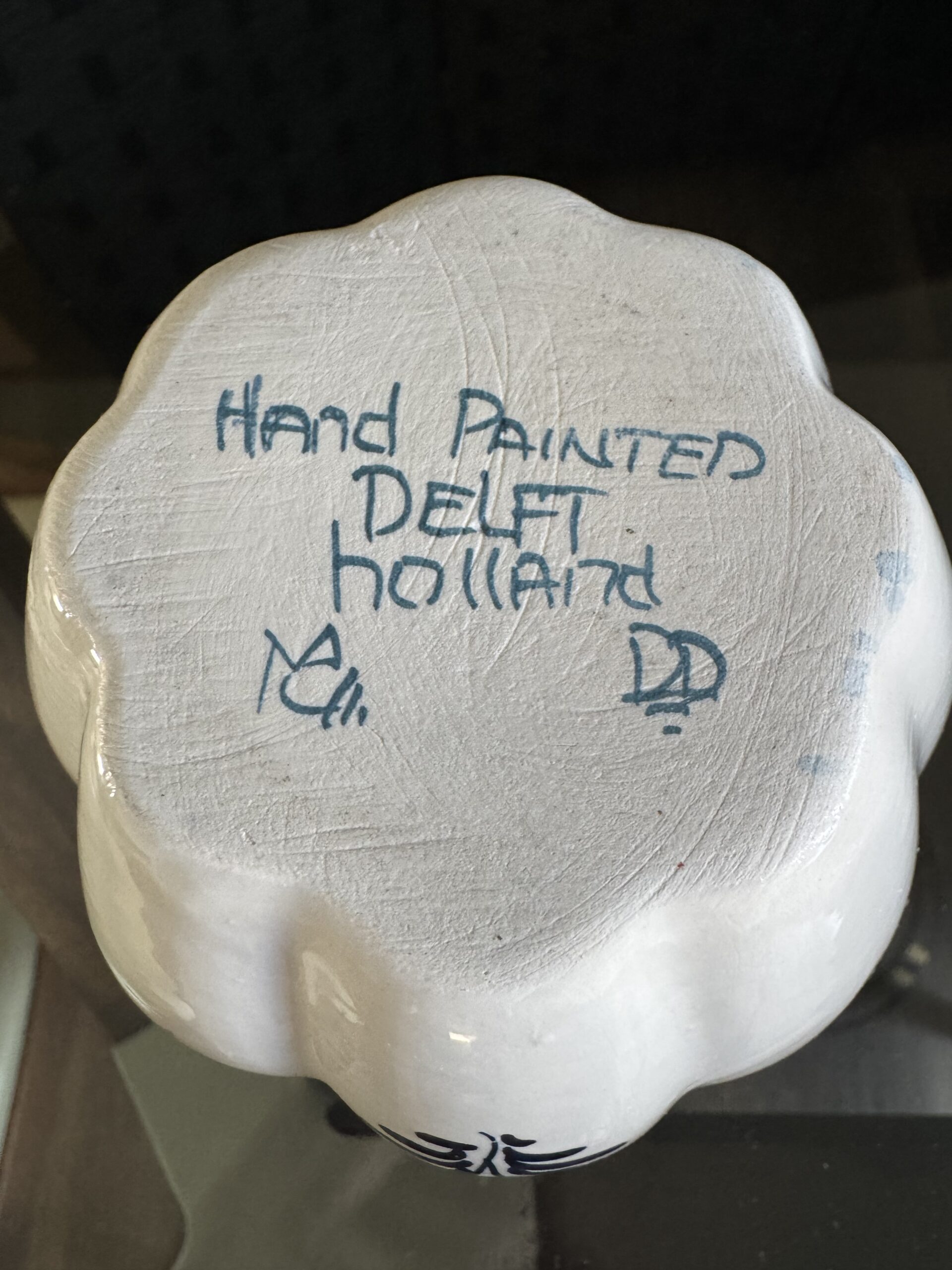 Delftware has been produced in the Netherlands since the 17th century as a European interpretation of Chinese porcelain. Over time, it developed its own national identity — incorporating tulips, windmills, and other Dutch motifs. This vase’s compact form and painterly detail are typical of mid-century export pieces and tourist ceramics.