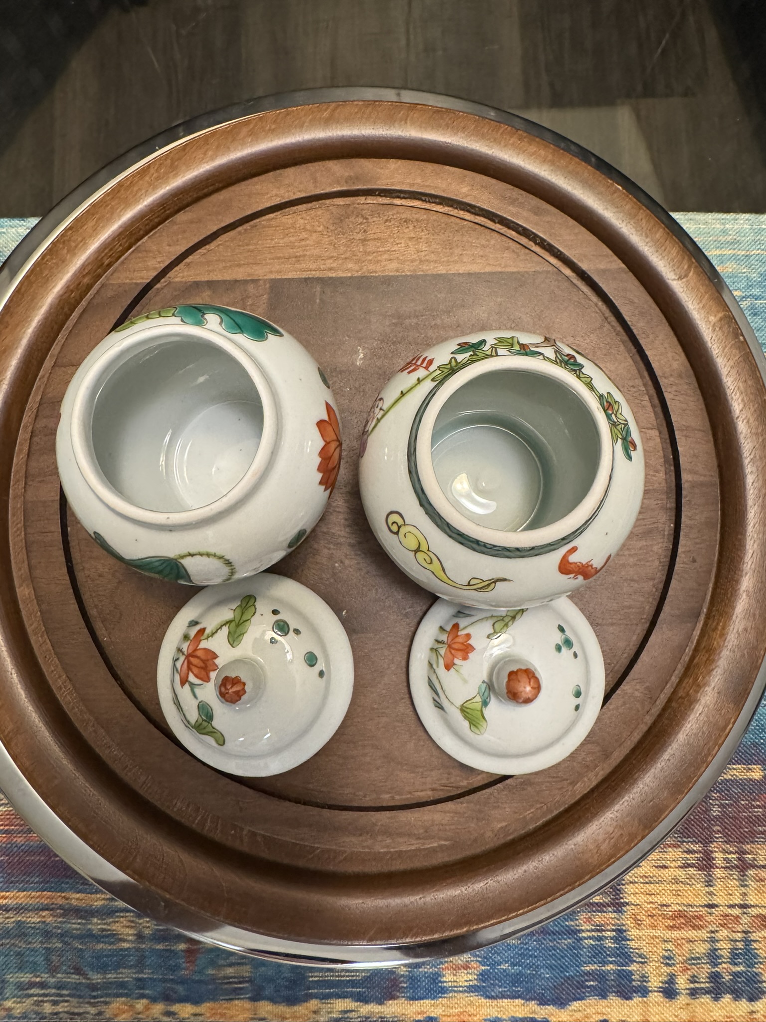 Miniature Famille Rose ginger jars with hand-painted lotus design, crafted in China during the late Qing Dynasty.