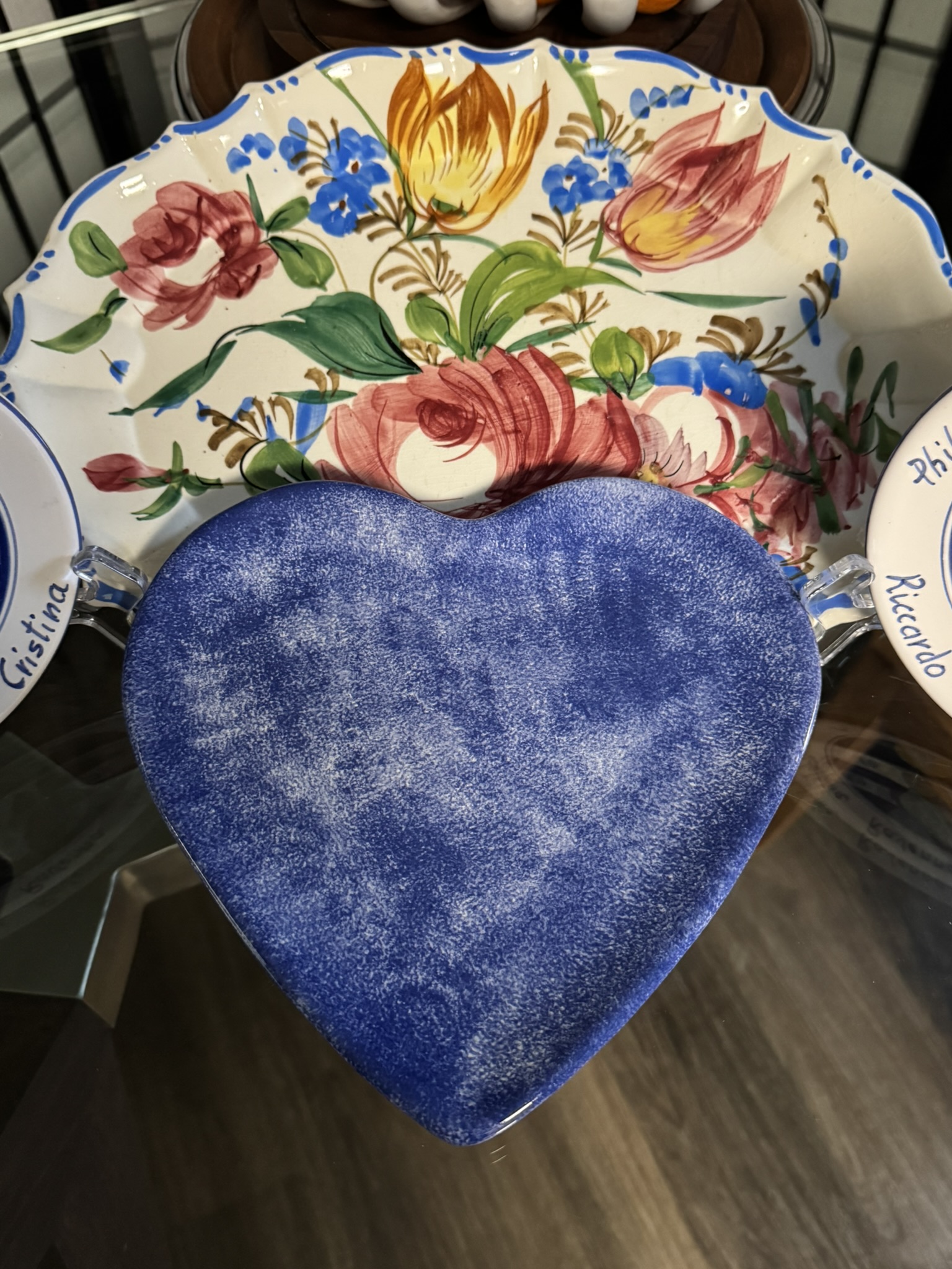 Add a touch of rustic Italian charm to your table with this Ancora heart-shaped ceramic plate. Hand-painted using a traditional spongeware technique, each piece carries its own unique, textured pattern in rich blue tones.