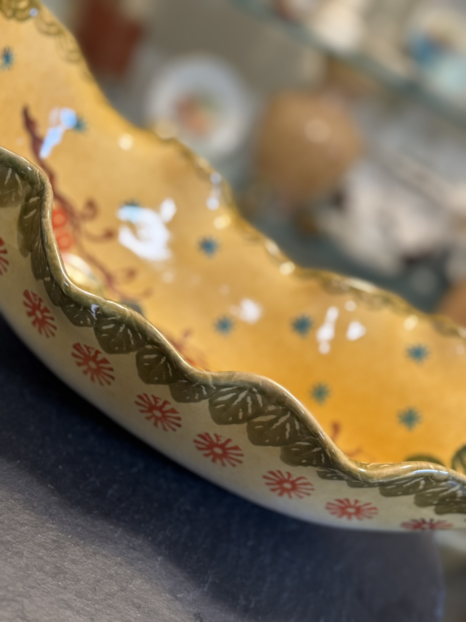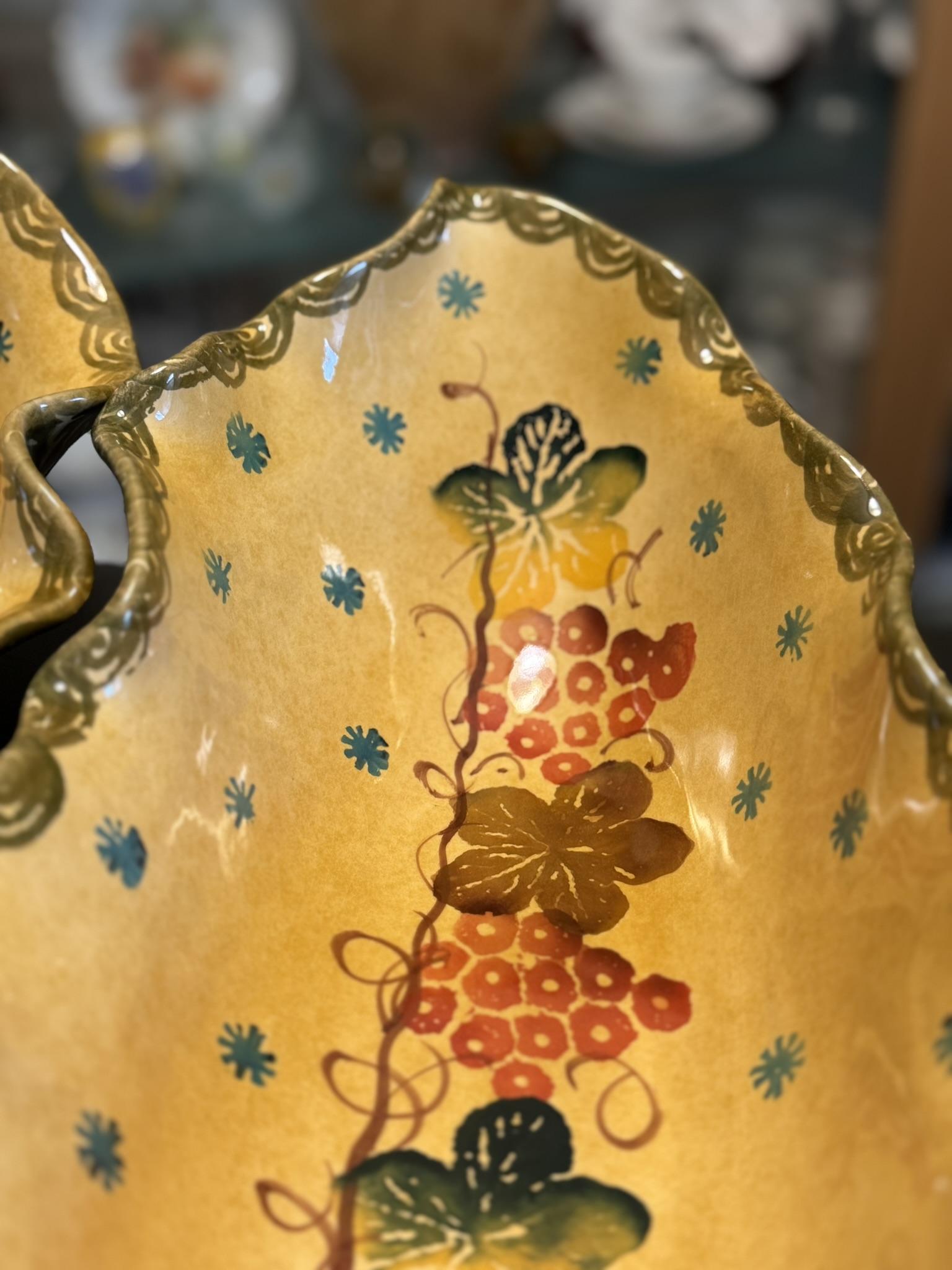 Italian Grapevine Serving Dishes — a lively and rustic expression of Italy’s ceramic bounty, rendered in form and function. These oblong dishes feature deep yellow fields punctuated by hand-painted clusters of red grapes and trailing green leaves, with wavy rims and light speckling evoking farmhouse authenticity.