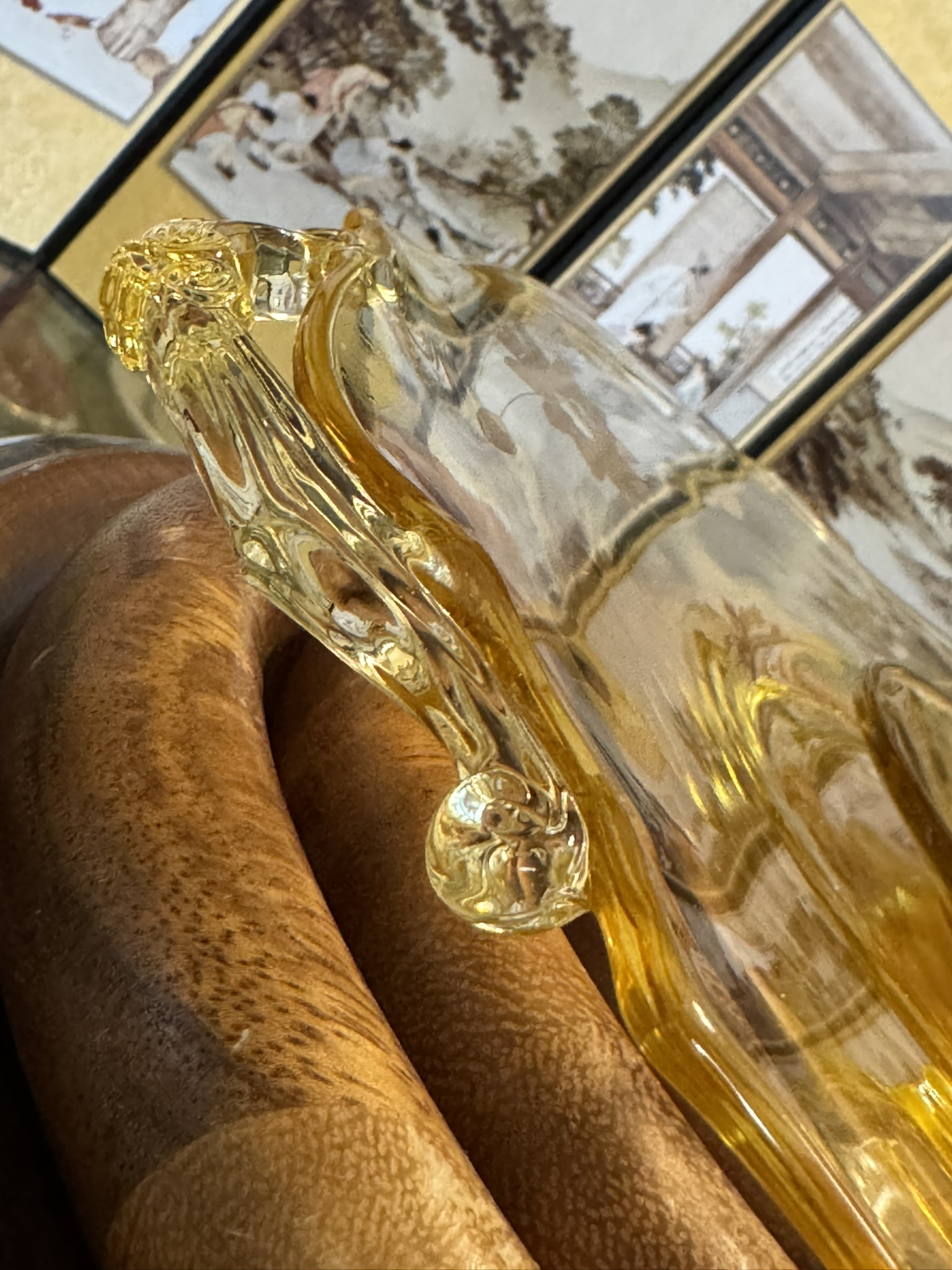 1930s Lancaster Glass Company “Jubilee” platter in pressed floral pattern with molded handles, likely in clear crystal.
