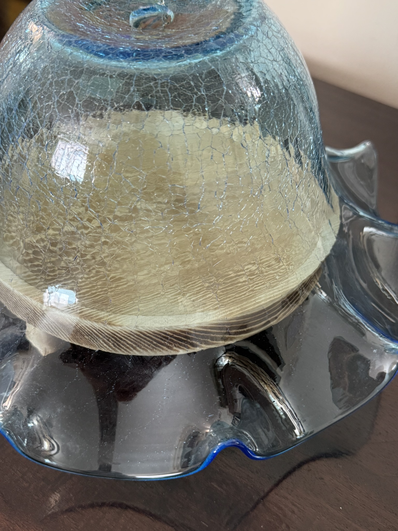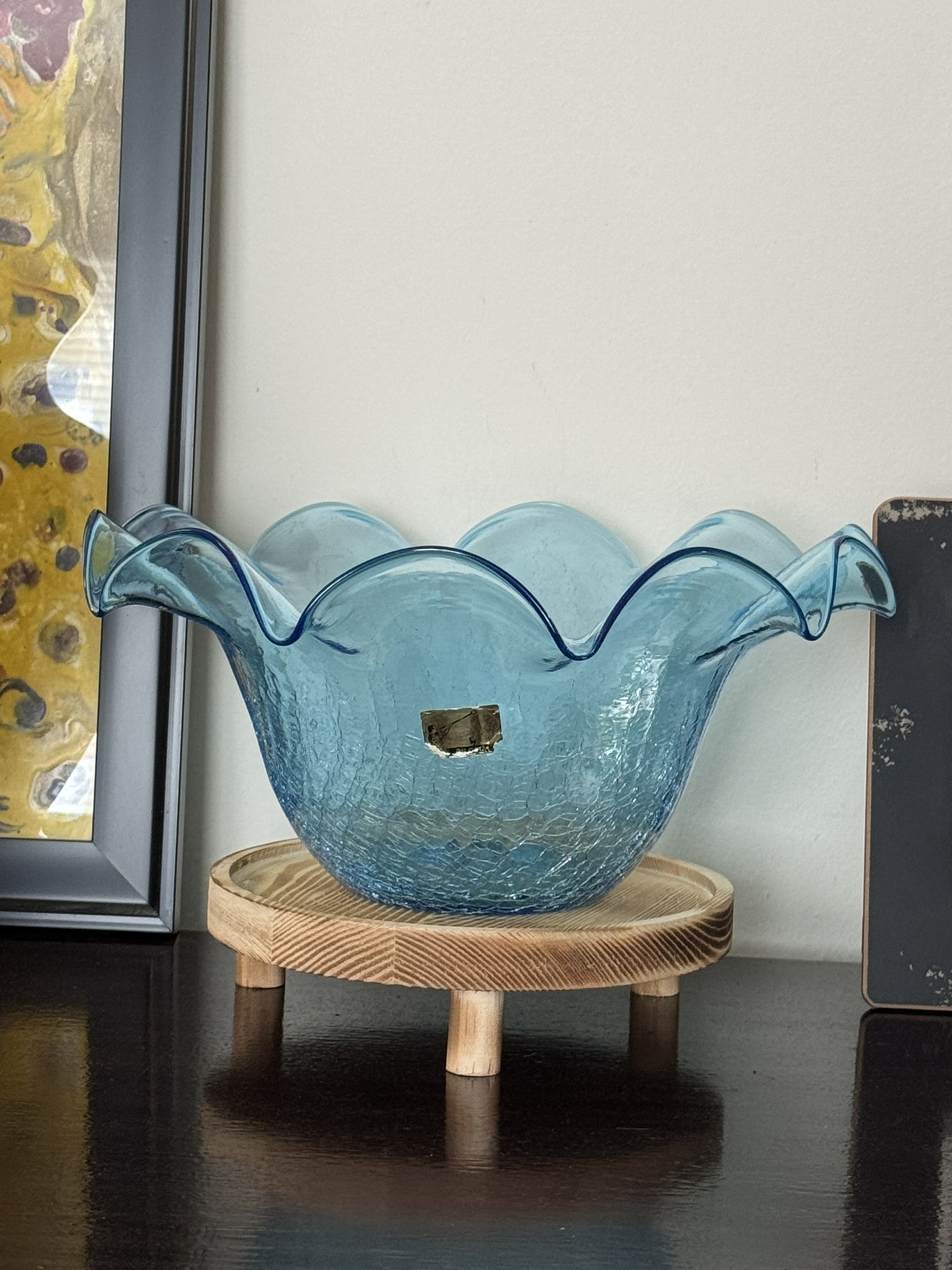Mid-century crackle glass bowl by Pilgrim Glass of West Virginia, in ocean blue.