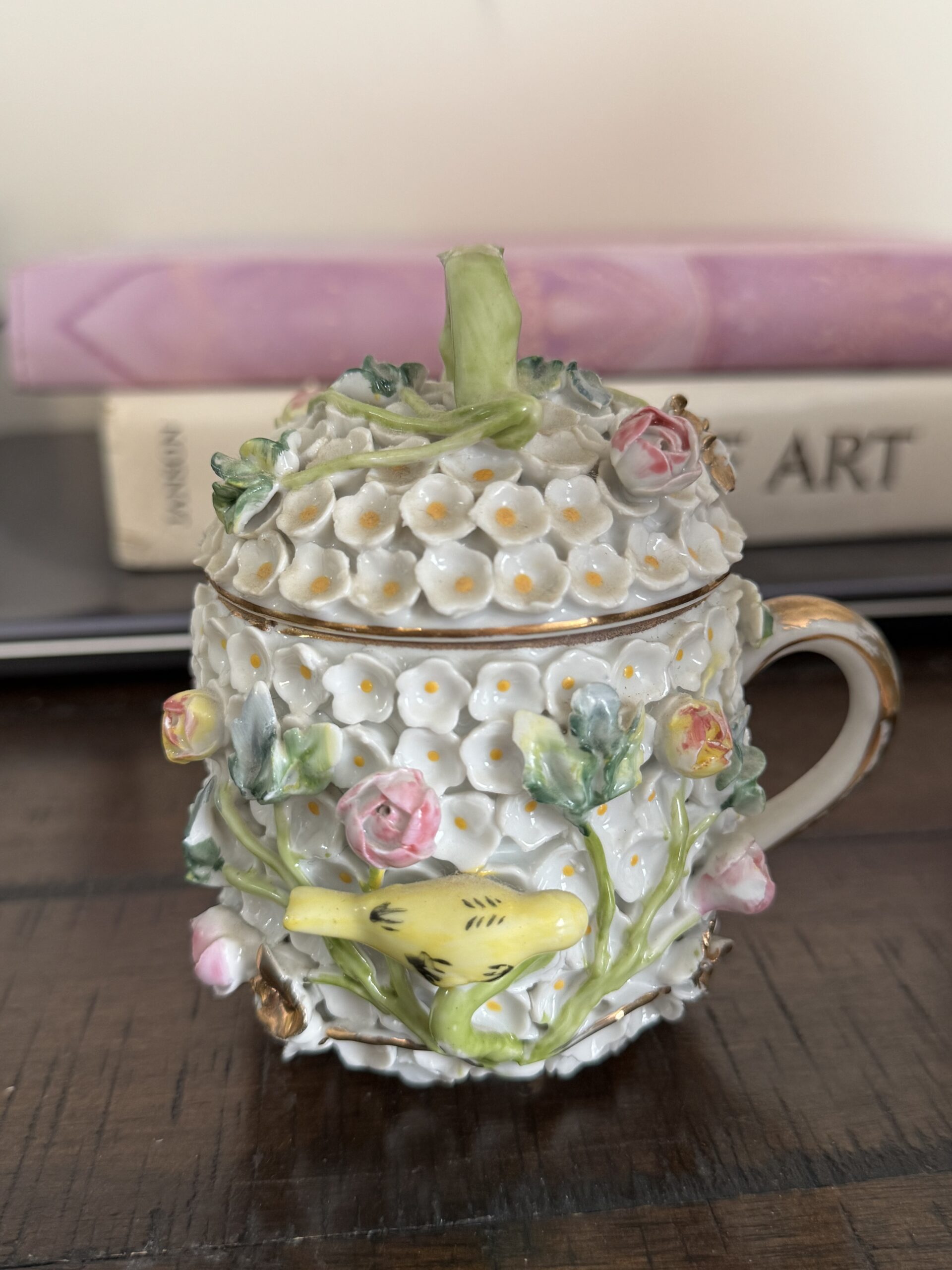 Mid 20th-century Meissen-Style cup and lid with dense Schneeballen(snowball) floral encrustations.