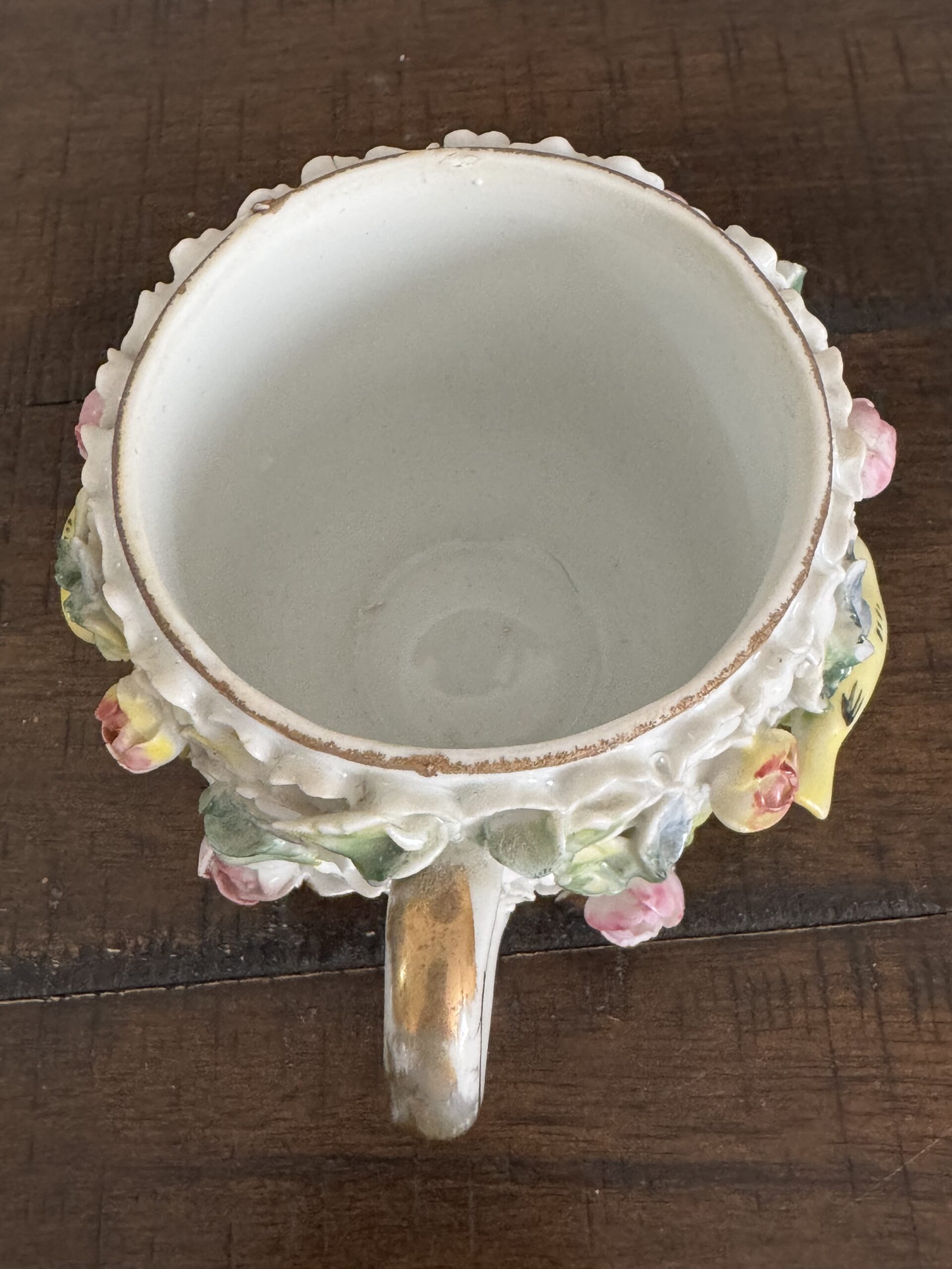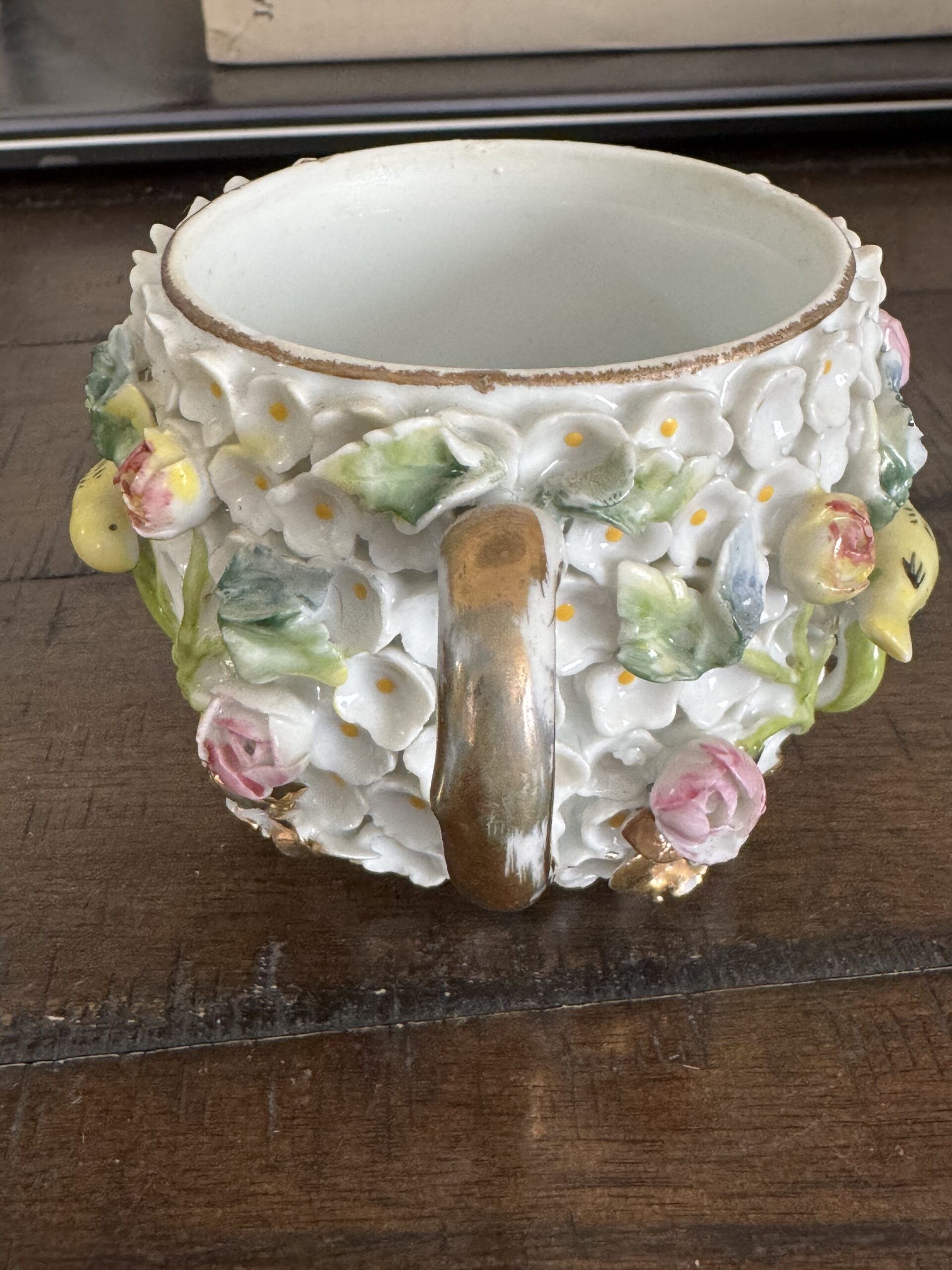 • Decoration: Hand-modeled florals, figural insects, green handle, gilded accents