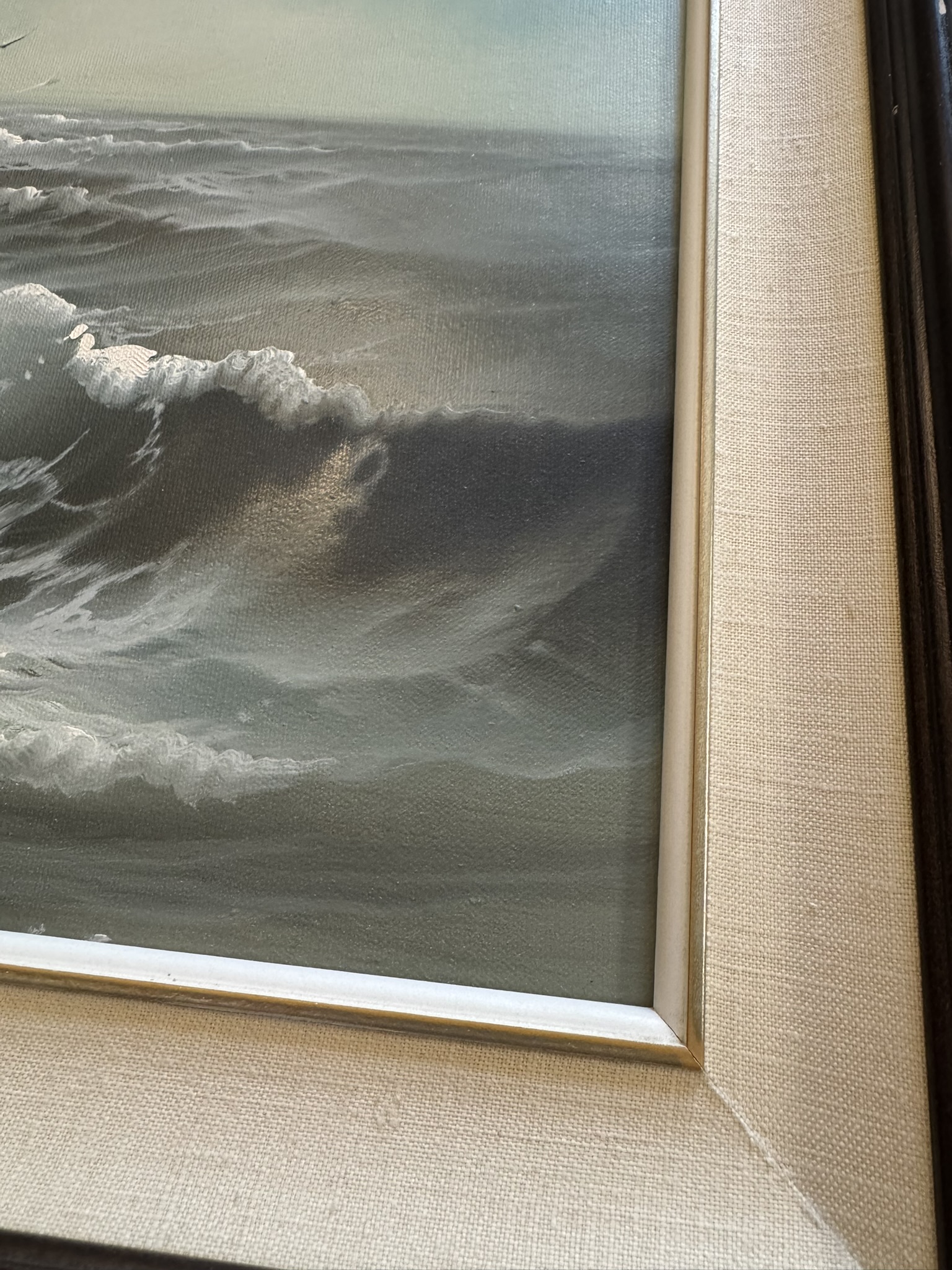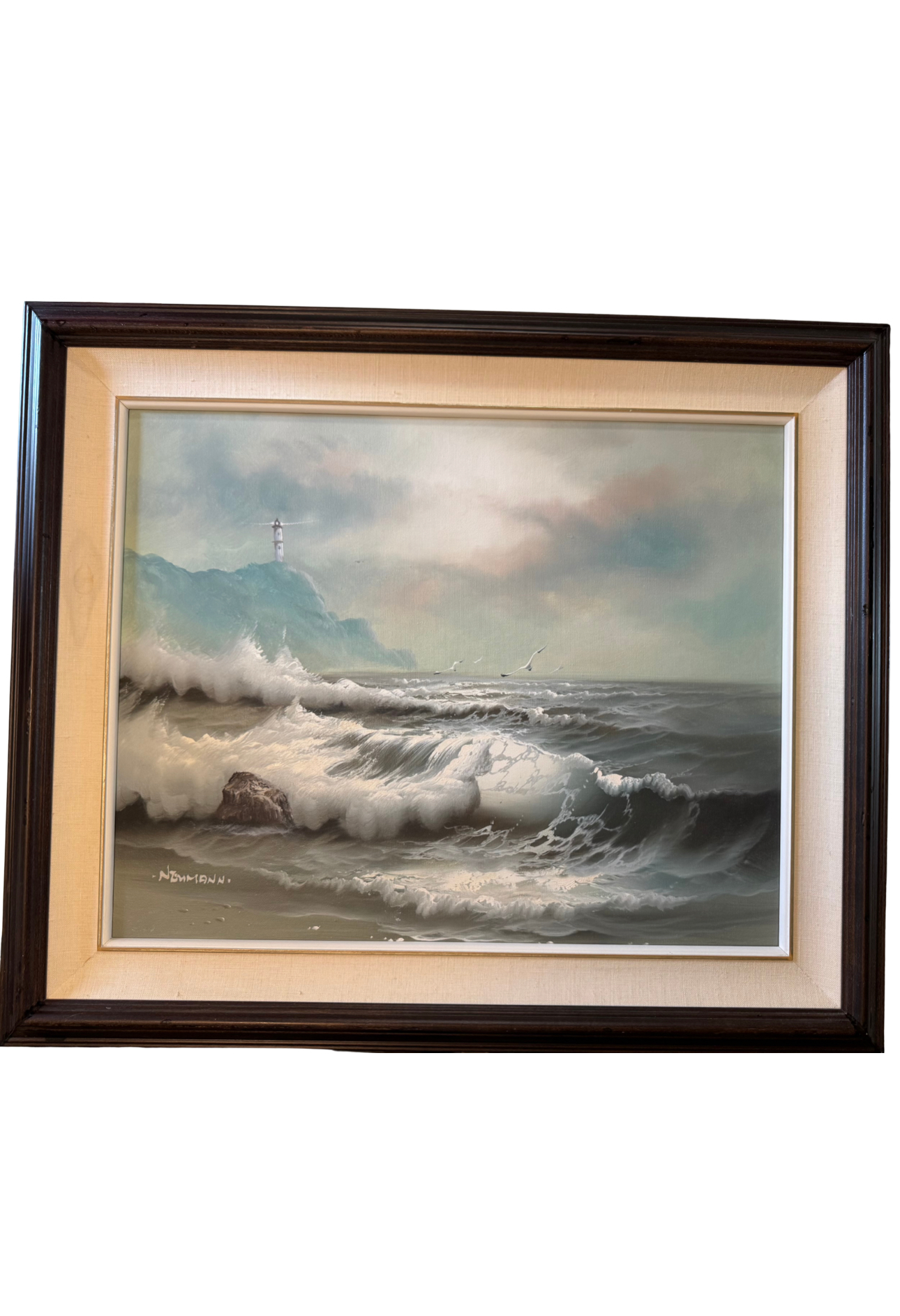 Neumann, a listed artist known for seascapes and landscapes, achieved recognition for dramatic lighting and naturalistic compositions. As an original signed oil on canvas, the work exemplifies mid‑century maritime painting and carries strong collector appeal.