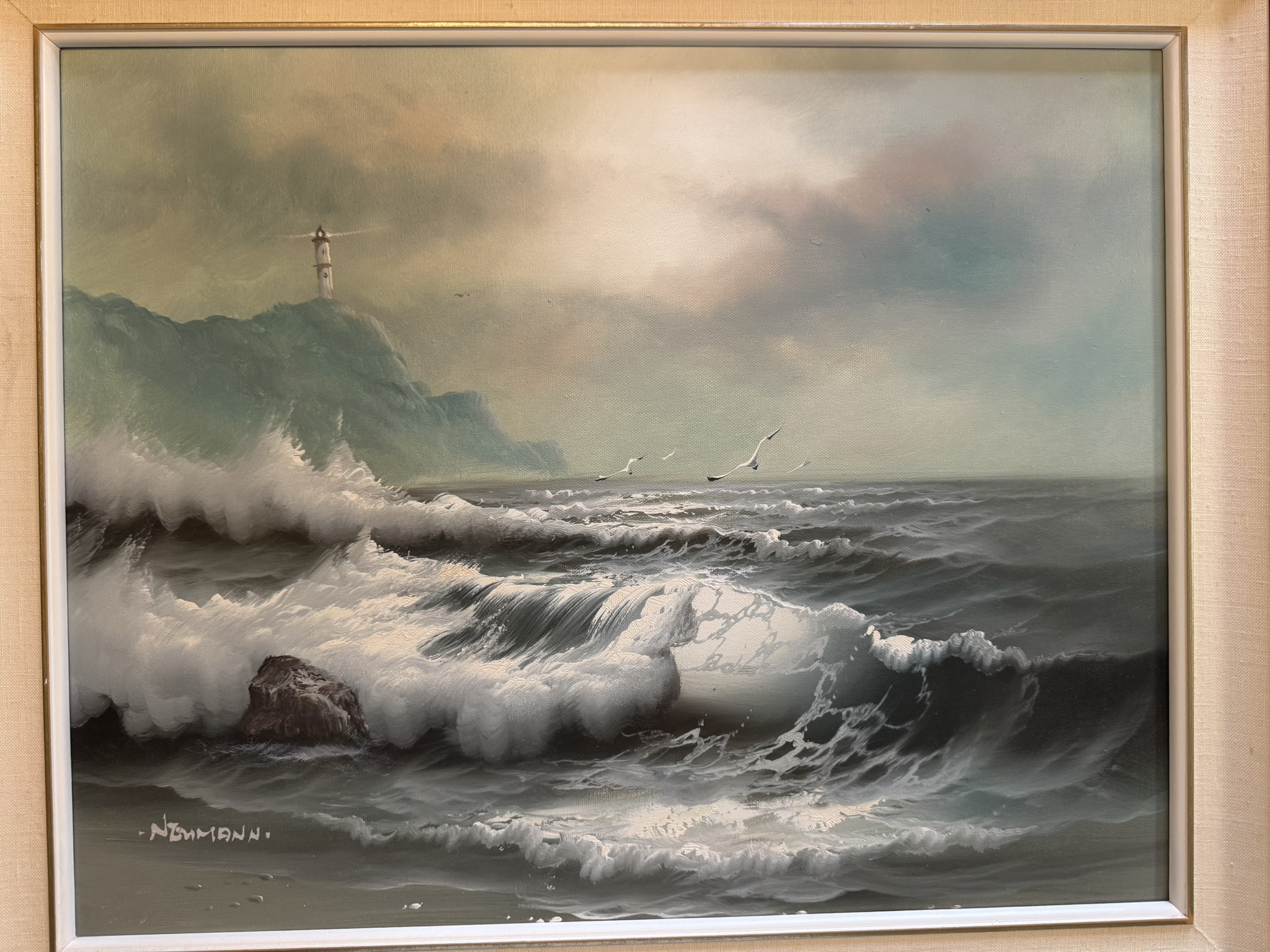 Evocative and powerful, this mid‑century seascape by Karl Neumann captures the dramatic interplay between light and sea. The lighthouse serves as a symbol of guidance and safety amid turbulent waves, rendered with masterful realism.
