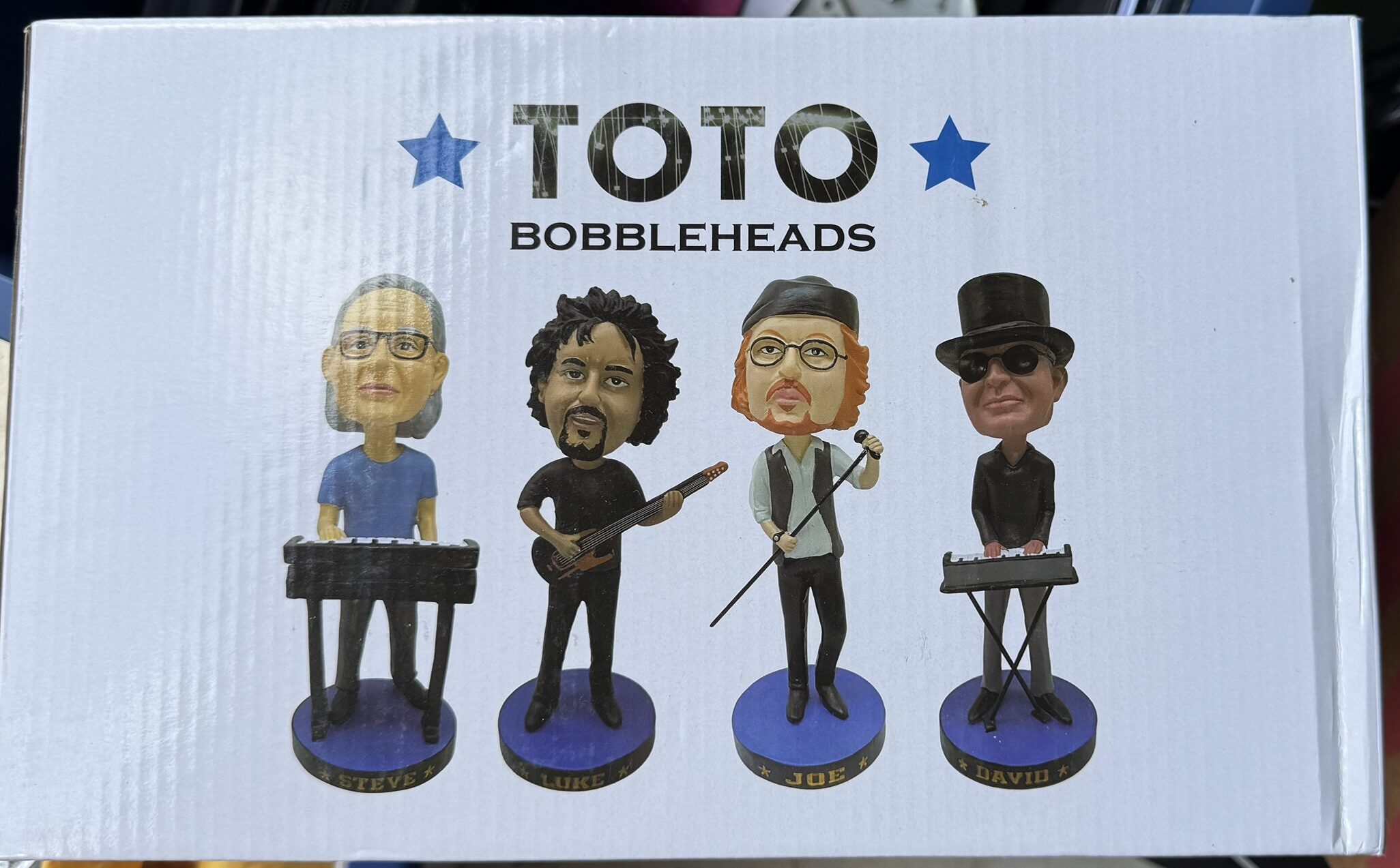 This limited-edition set of Toto bobbleheads celebrates one of the most iconic rock bands of the late 20th century — known for genre-defying hits like “Africa” and “Rosanna.” The set includes stylized resin figurines of band members, with exaggerated features and spring-mounted heads, packaged together in their original presentation box.