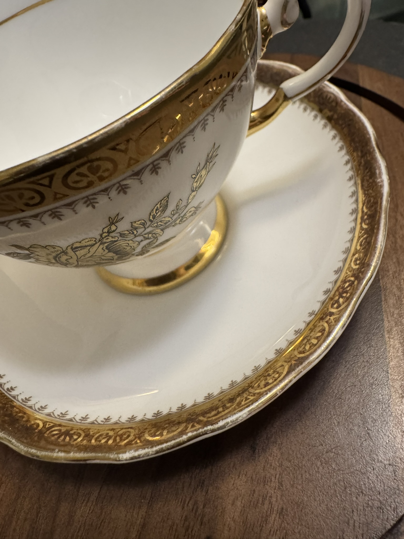 • Decoration: Gold floral motif with gilded rim