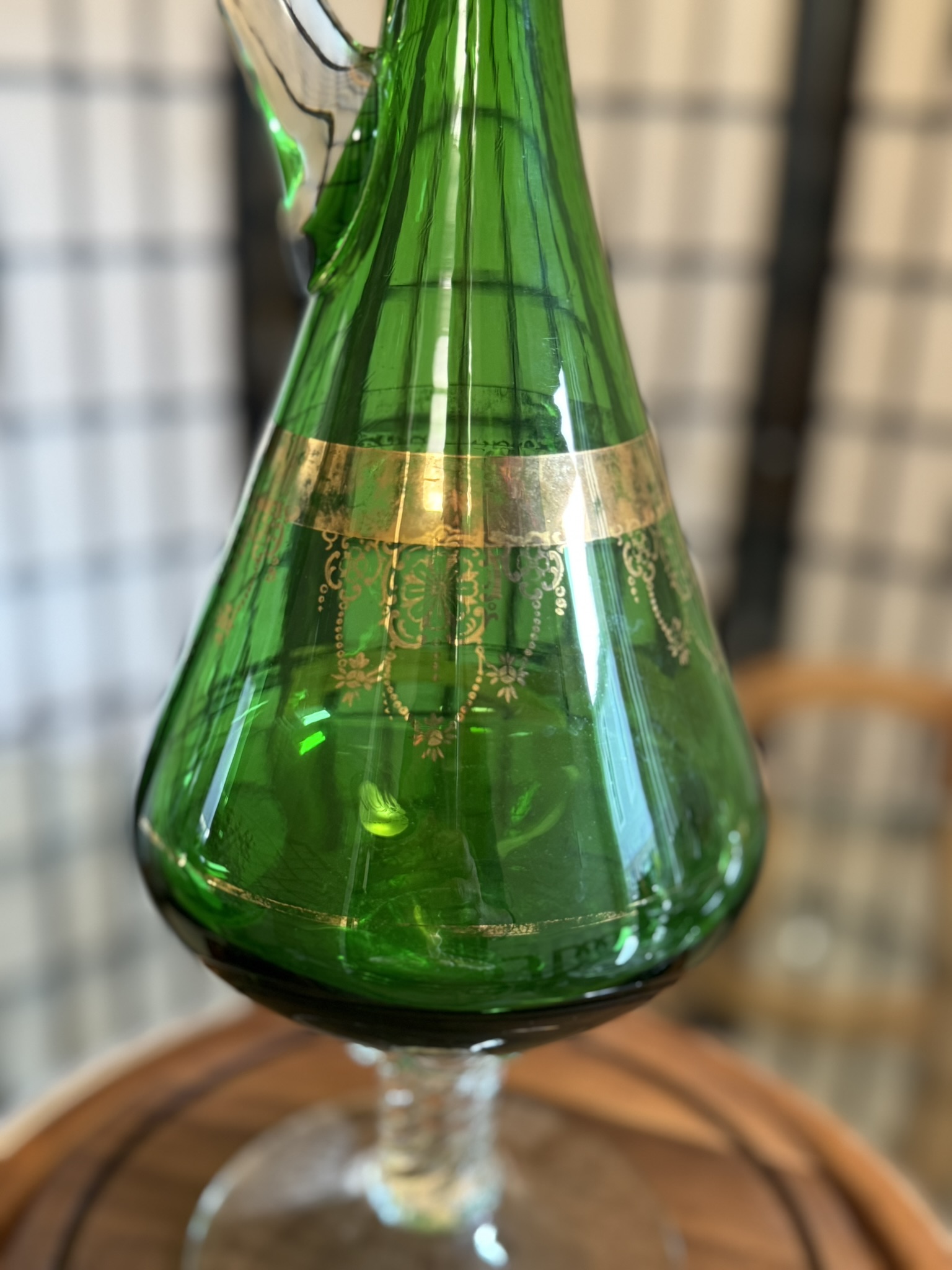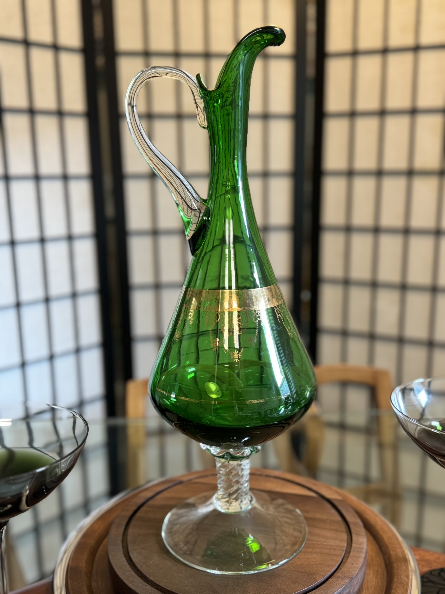 Hand-blown and finished with ornate gold banding, this decanter was designed not only for serving liqueurs or cordials, but to dazzle on a bar cart or credenza. Green and gold were favored combinations in the 1950s–60s for their richness and visual drama — symbols of leisure and sophistication.