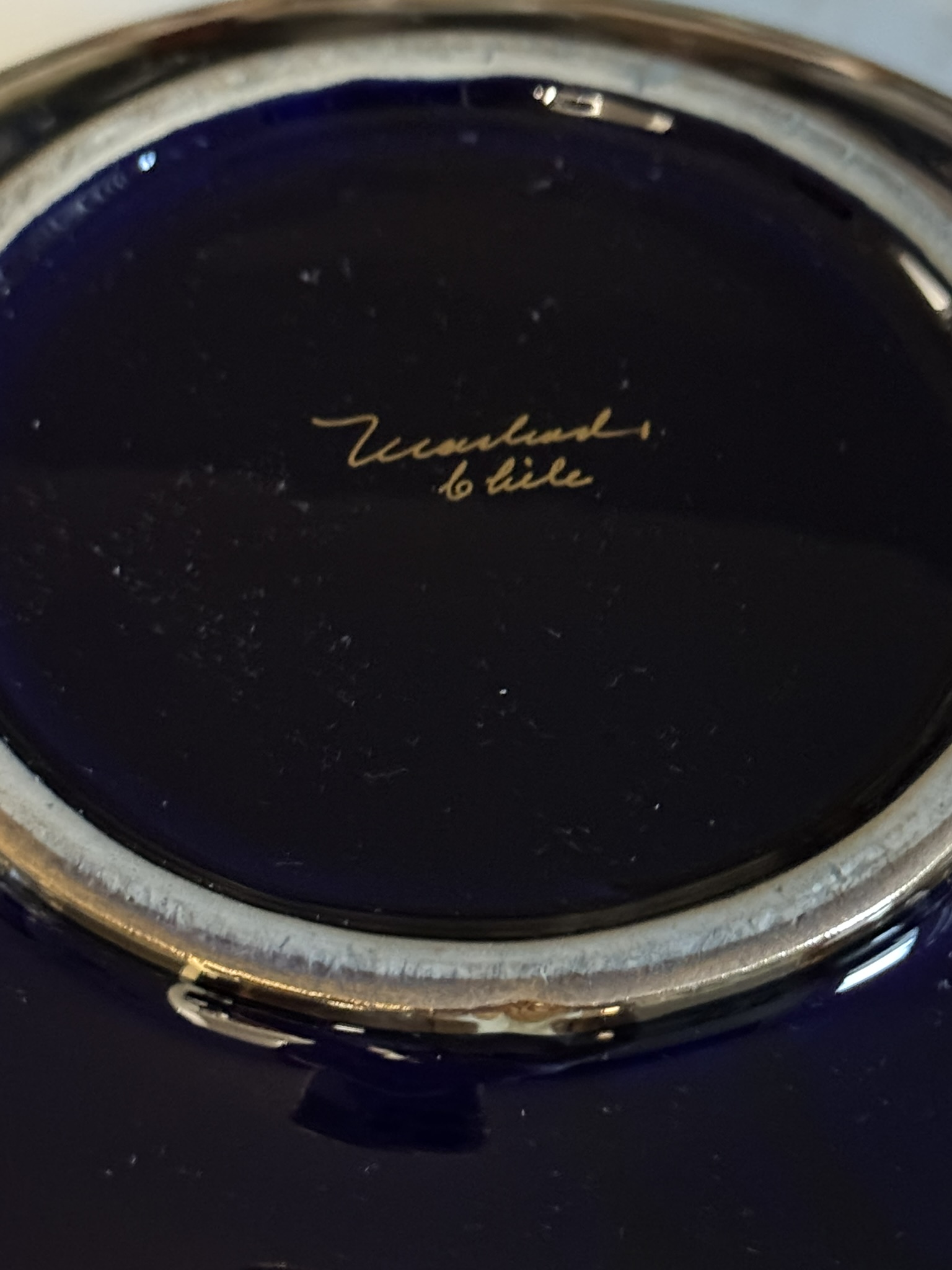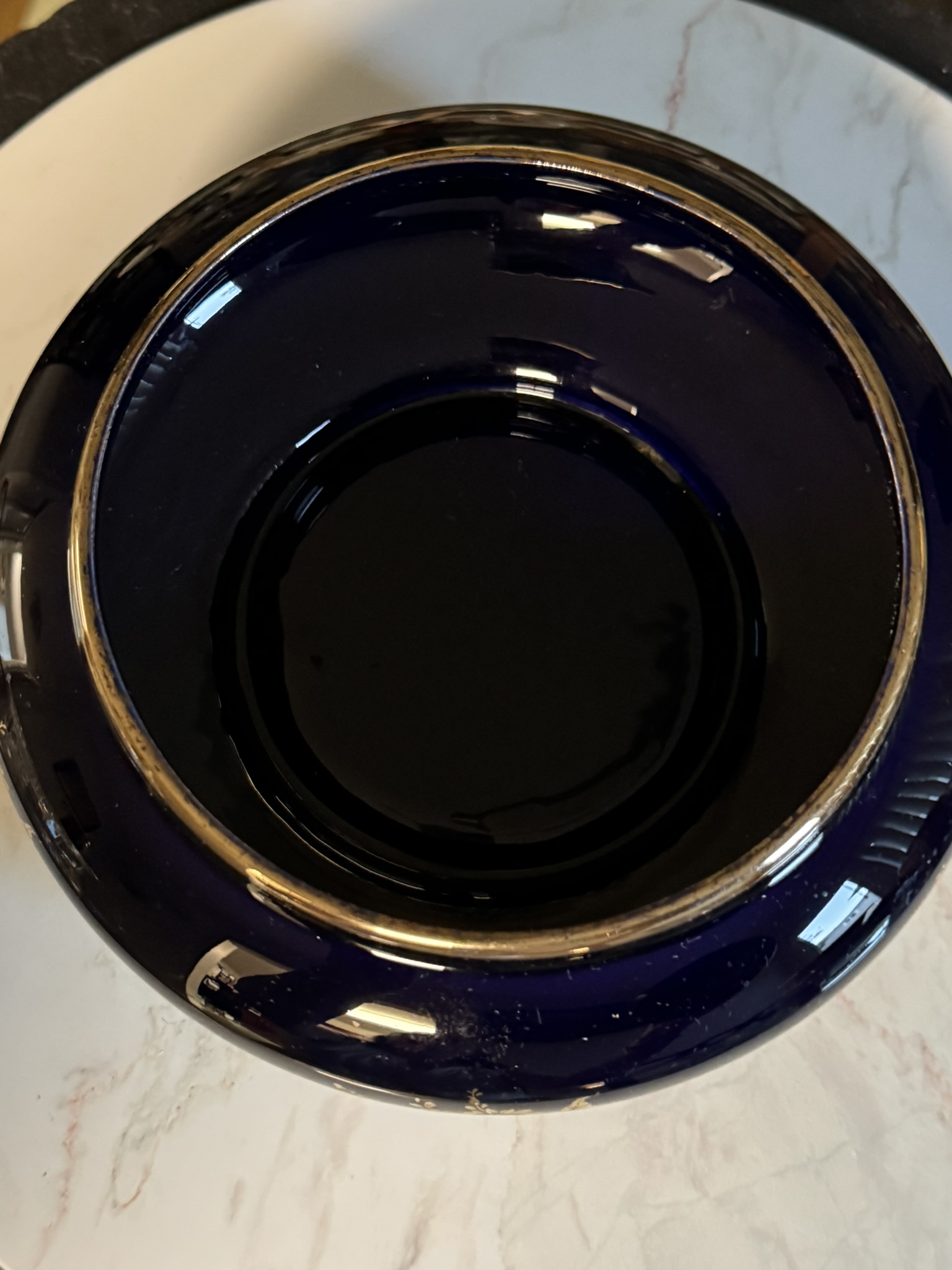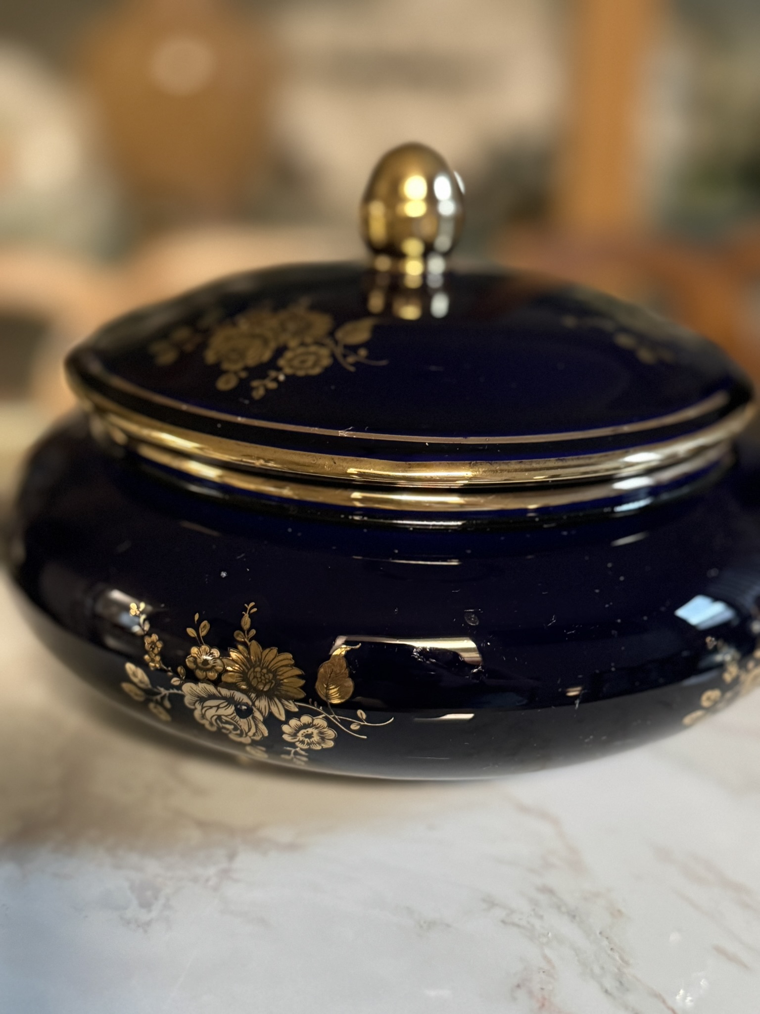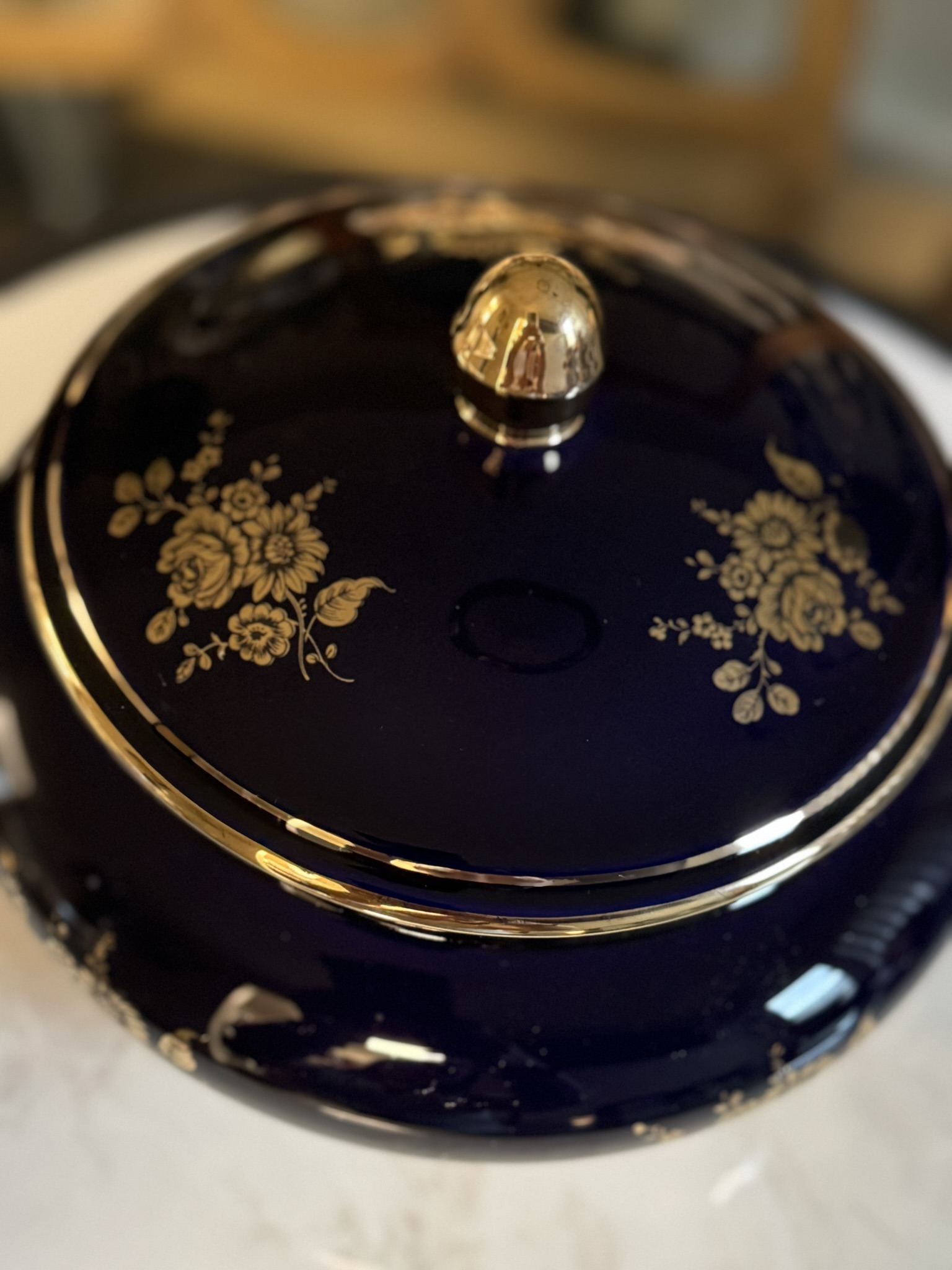Opulent yet unpretentious, this mid-century covered dish speaks to the Latin American embrace of richly glazed porcelain for formal dining. Marked “Woulind Chile” — a relatively obscure maker — the piece combines deep cobalt tones with gilt floral scrollwork and a charmingly curved form.